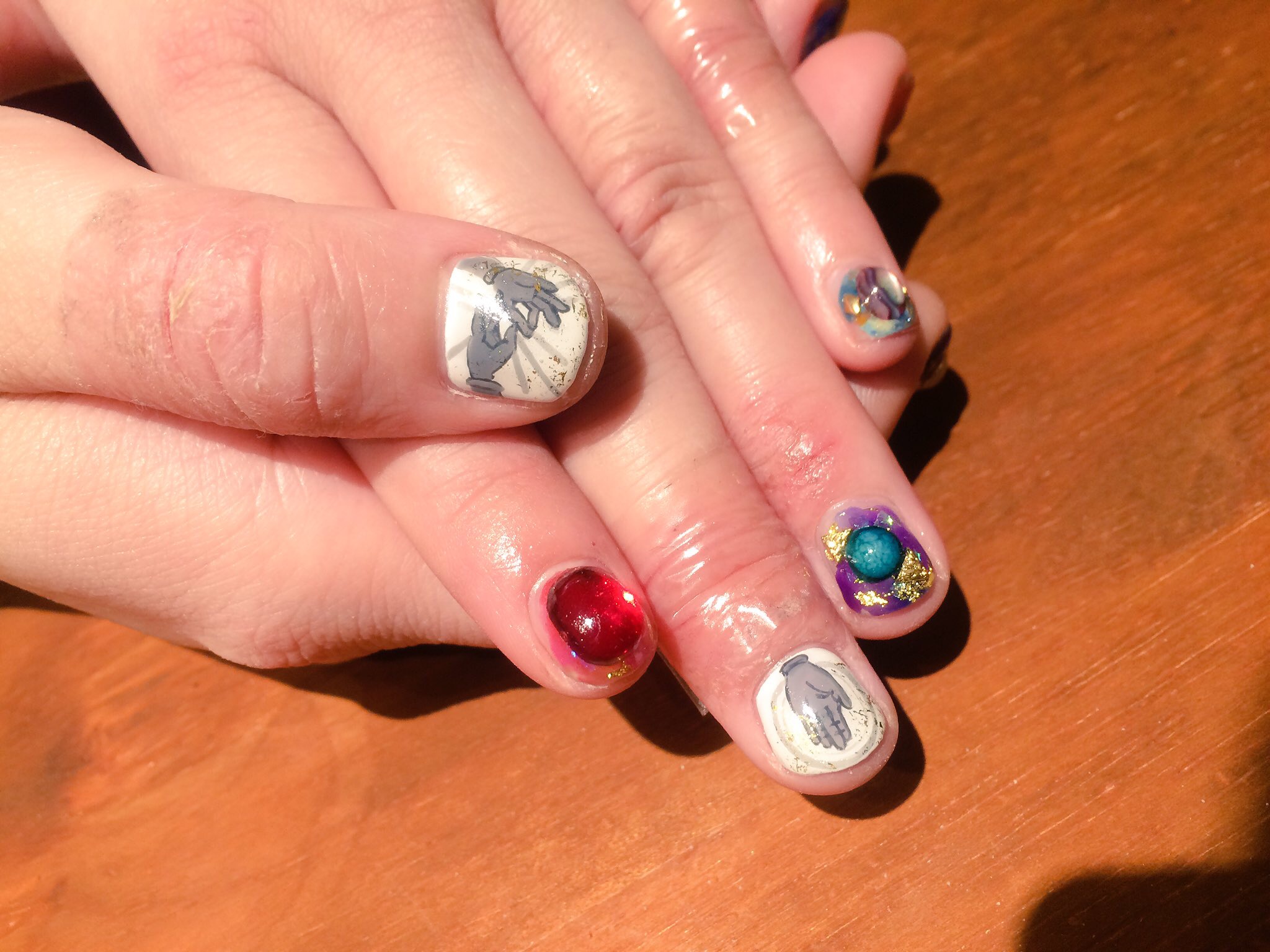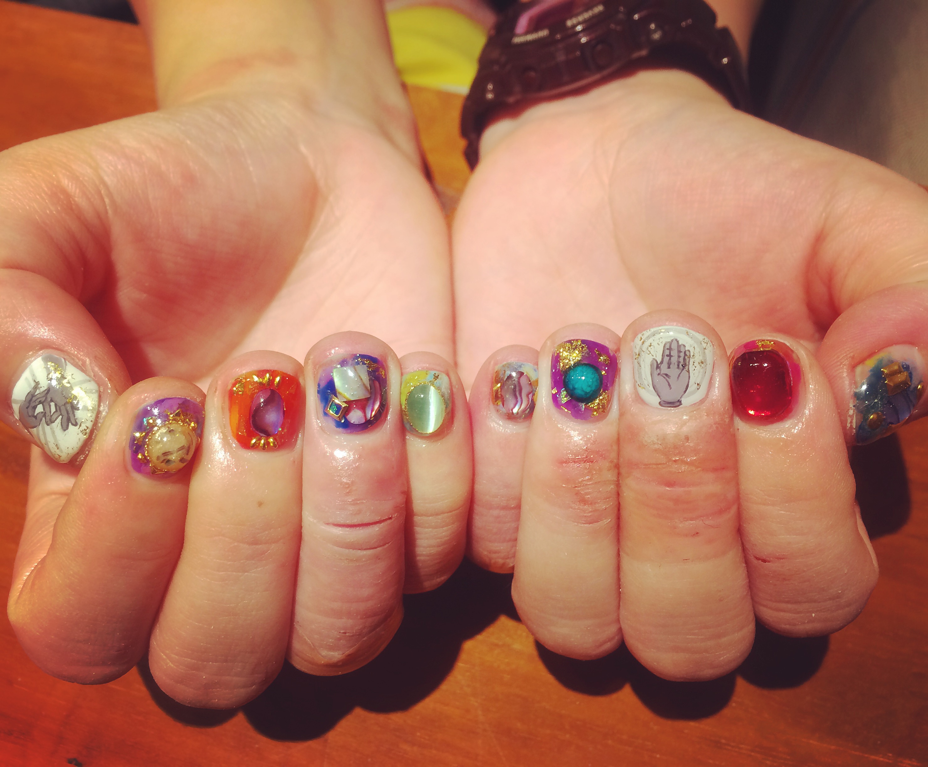 右手の親指と左手の中指だけ、大仏をイメージした手のアートになっています(^.^)